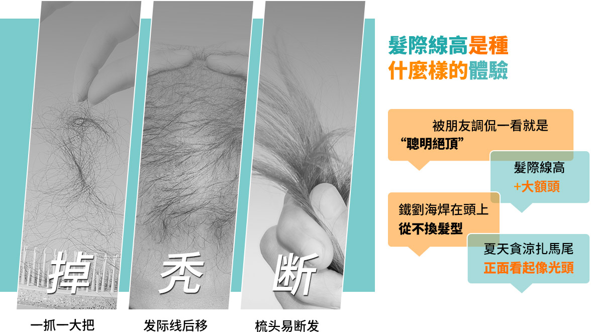 將髮際綫細分為前額區、額角度、顳角區、鬢角區,粗細毛囊分區設計,360度審美無死角,視角美觀。